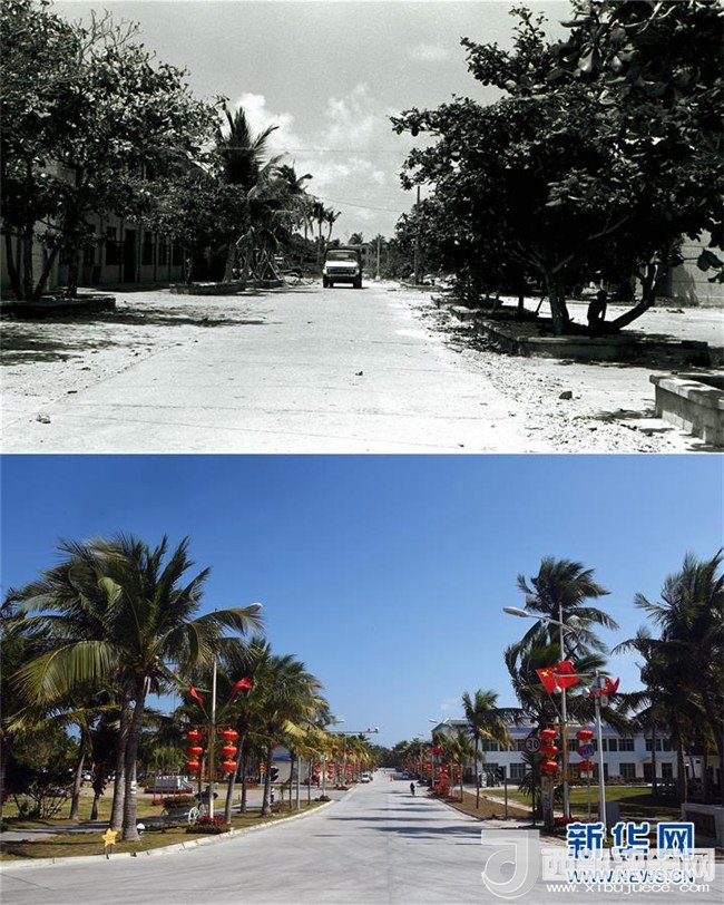 拼版照片為西沙永興島北京路今昔對比(上圖為1991年5月新華社記者姜恩宇攝,下圖為2016年2月5日新華社記者楊冠宇攝)。