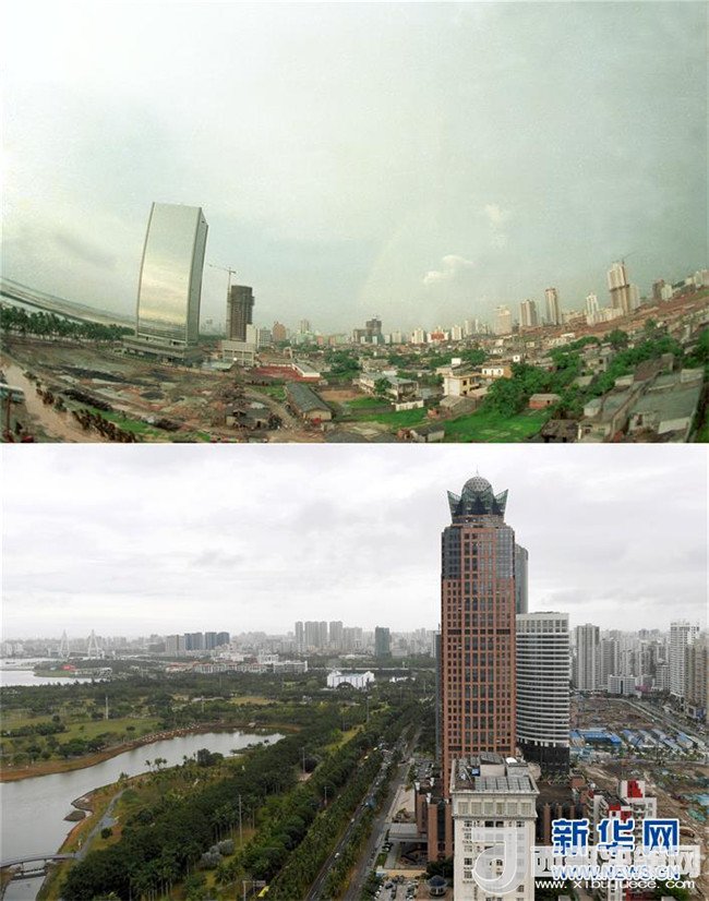 拼版照片為??谑袨I海大道南側(cè)的建筑物今昔對比(上圖為1990年1月10日新華社記者姜恩宇攝,下圖為2018年4月15日新華社記者趙穎全攝)。