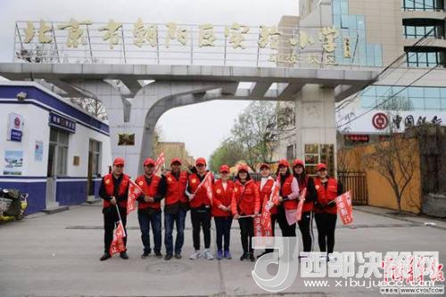 北京市朝陽區(qū)實(shí)驗(yàn)小學(xué)雄安校區(qū),參加“家校警”護(hù)學(xué)隊(duì)的當(dāng)?shù)丶议L志愿者在校門口。