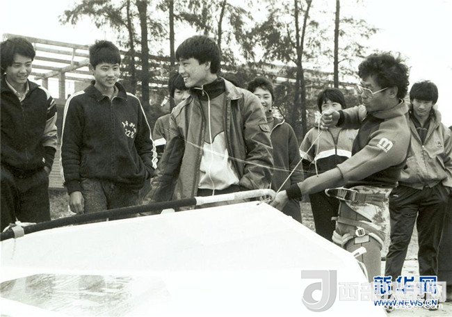 來自臺灣的帆板運動員在海口和當?shù)厝罕娊涣鳎?989年1月16日攝)。新華社記者 姜恩宇 攝