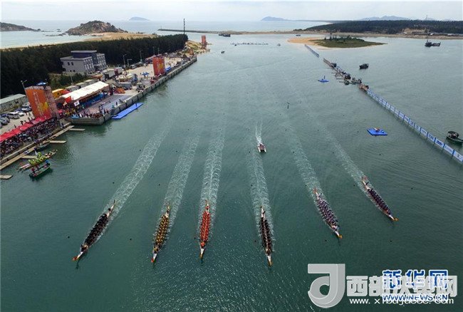 運動員參加在海南萬寧和樂鎮(zhèn)港北港舉行的2016中華龍舟大賽萬寧站比賽(2016年3月10日無人機拍攝)。新華社記者 楊冠宇 攝