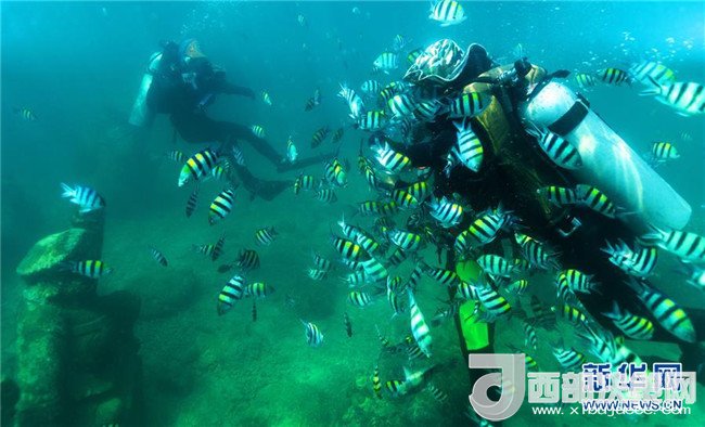 由教練帶領的潛水愛好者在海南省分界洲島附近海域下潛(2017年5月1日攝)。新華社發(fā)(童國強攝)