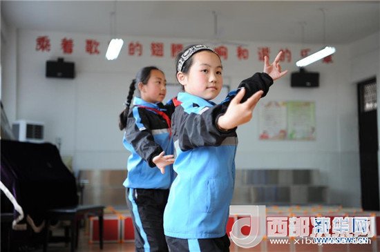4月25日,陜西省勉縣溫泉鎮(zhèn)中心小學(xué)學(xué)生在音樂(lè)教室內(nèi)進(jìn)行舞蹈練習(xí)。