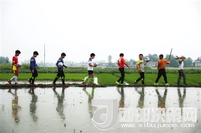 4月21日,四川省綿陽(yáng)市迎新鄉(xiāng)小學(xué)足球隊(duì)的隊(duì)員們走在鄉(xiāng)間的田埂上,周末即使沒有訓(xùn)練,他們也會(huì)約著一起玩球。