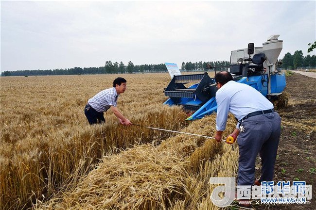 當(dāng)日,在河南省鄧州市腰店鎮(zhèn)國家雜交小麥項(xiàng)目制種基地,專家組對(duì)小麥進(jìn)行田間隨機(jī)多點(diǎn)取樣調(diào)查,收割機(jī)對(duì)小麥進(jìn)行實(shí)打?qū)嵤铡y產(chǎn)數(shù)據(jù)表明,雜交小麥種子生產(chǎn)在豐產(chǎn)性、抗逆性、抗病性、適應(yīng)性等方面表現(xiàn)優(yōu)異,標(biāo)志著我國雜交小麥研發(fā)進(jìn)入大田應(yīng)用和產(chǎn)業(yè)化階段。新華社記者 馮大鵬 攝