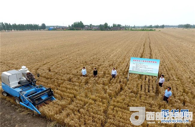 5月29日,在河南省鄧州市腰店鎮(zhèn)國家雜交小麥項(xiàng)目制種基地,收割機(jī)正在收割小麥。