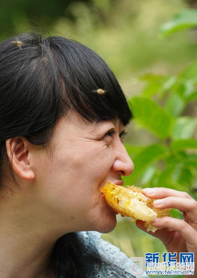 6月1日,一名游客在黃龍縣石堡鎮(zhèn)油坊窯蜂場內(nèi)品嘗蜂蜜。新華社記者邵瑞攝