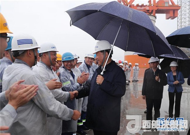 風(fēng)急云低,雨流如注。13日下午,習(xí)近平來到中集來福士海洋工程有限公司煙臺基地。作為國內(nèi)率先進(jìn)入海洋工程行業(yè)的企業(yè),中集來福士用10年左右時間,國產(chǎn)化率從不足10%提高到60%。在廠區(qū)碼頭上,習(xí)近平撐著雨傘,趟著積水,近距離察看??吭谶@里的自升式修井生活平臺,遠(yuǎn)眺“藍(lán)鯨1號”超深水雙鉆塔半潛式鉆井平臺、“泰山”龍門吊、海洋牧場平臺,向企業(yè)負(fù)責(zé)人詳細(xì)了解高端海洋工程設(shè)備制造、維護(hù)、運(yùn)行情況。海風(fēng)吹起了衣襟,雨水打濕了褲腿。習(xí)近平站在雨中,同圍攏過來的工人們一一握手、親切交談,向作業(yè)平臺上的工人們揮手致意。習(xí)近平指出,國有企業(yè)特別是中央所屬國有企業(yè),一定要加強(qiáng)自主創(chuàng)新能力,研發(fā)和掌握更多的國之重器。國有企業(yè)要深化改革創(chuàng)新,努力建成現(xiàn)代企業(yè)。要堅持黨對國有企業(yè)的領(lǐng)導(dǎo)不動搖,堅持建強(qiáng)國有企業(yè)基層黨組織不放松,為做強(qiáng)做優(yōu)做大國有企業(yè)提供堅強(qiáng)組織保證。