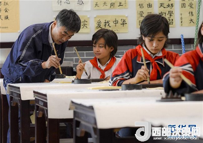 2017年9月26日,在新疆疏附縣托克扎克鎮(zhèn)中心小學書法教室內,王莊鐵老師在教同學們寫毛筆字。新華社記者 趙戈 攝