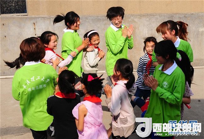 2011年4月28日,武漢理工大學研二學生郎坤和農民工子弟學校武漢凌智小學的孩子們一起在屋頂平臺上做游戲。新華社記者 程敏 攝