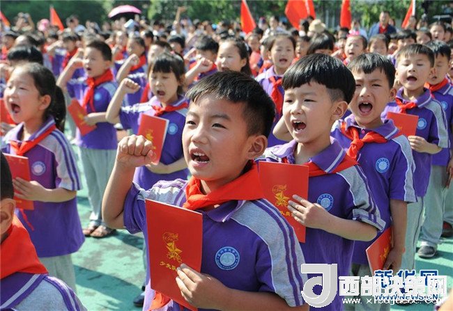 在2017年5月26日安徽省亳州市譙城區(qū)風華小學舉行的入隊儀式上,孩子們在宣讀入隊誓詞。新華社發(fā)(張延林 攝)