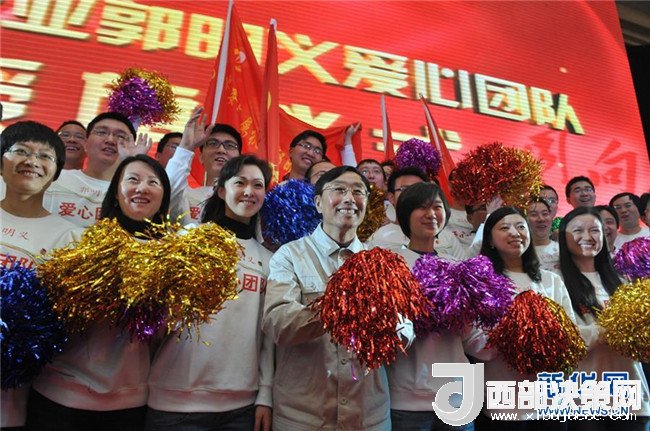 在2012年3月4日舉行的“中央企業(yè)郭明義愛心團隊”授旗儀式現(xiàn)場,郭明義與愛心團隊合影。新華社發(fā)(胡慶明 攝)