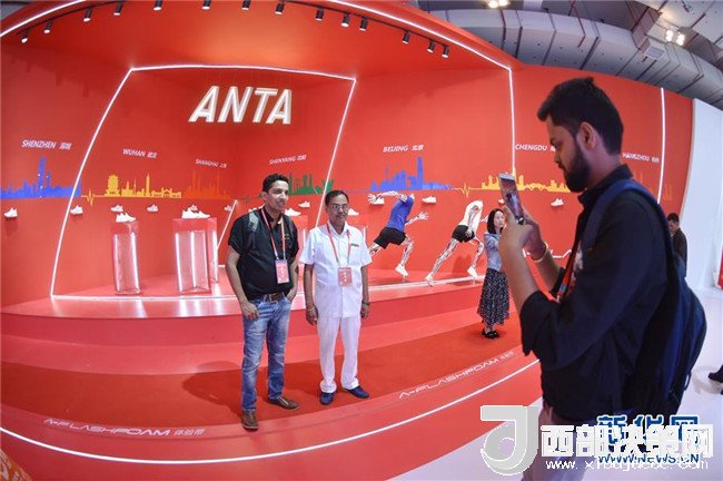 在一年一度的中國(晉江)國際鞋業(yè)暨國際體育產(chǎn)業(yè)博覽會上,來自印度的客商在安踏展位前留影(4月19日攝)。新華社記者 宋為偉 攝
