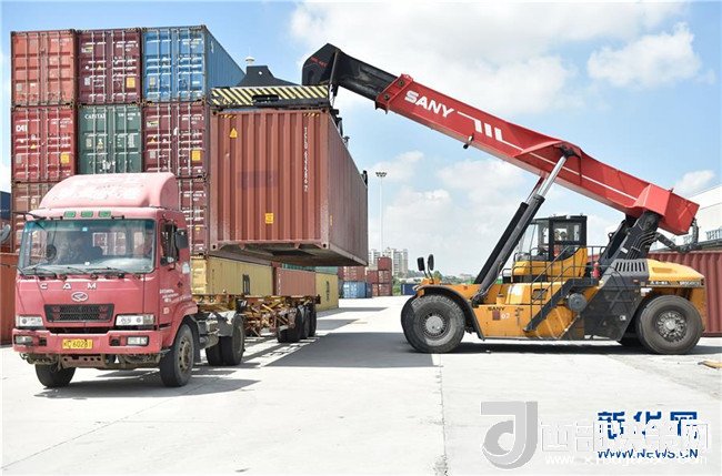 工程機械在福建晉江陸地港將集裝箱裝車(2017年7月12日攝)。新華社記者 宋為偉 攝