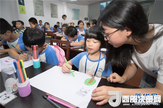7月26日,在柯橋區(qū)安昌街道社區(qū)文化禮堂,大學(xué)生志愿者陪同“小候鳥(niǎo)”上美術(shù)課。