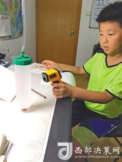 首先設(shè)計一個裝置,下部寬大的容器盛水,上部細長的管子可以觀察水的體積變化。然后將裝滿水的容器放入冰箱冷凍層,形成冰水混合物,此時水溫接近零攝氏度。最后將容器取出,用手持式測溫儀測量水溫……這一系列步驟,不是實驗室里進行的專業(yè)研究,而是南京師范大學(xué)附屬小學(xué)四年級學(xué)生徐子越和王美澄正在做的暑假作業(yè),他們通過觀察水的體積隨溫度的變化,來解釋冰為什么會浮在水面上。