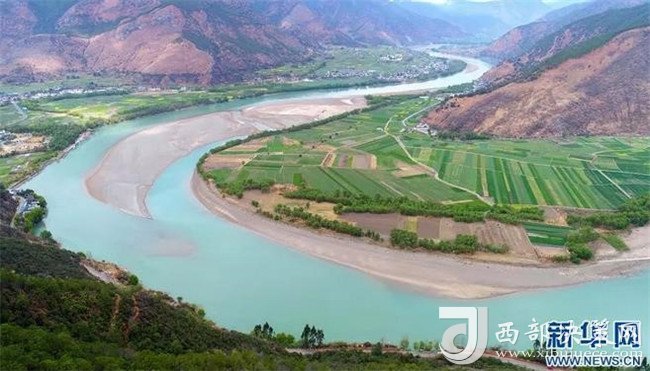 云南省麗江市石鼓鎮(zhèn)綠樹和農(nóng)田掩映下的“長(zhǎng)江第一灣”(來源:新華網(wǎng))
