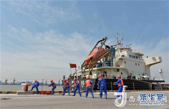 在長(zhǎng)江岸線南通段一處港口碼頭,一艘貨輪錨定后,工作人員合力牽引岸電連接電纜(6月2日攝)。新華社發(fā)(李存根 攝)