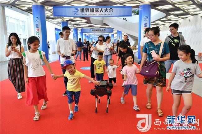 孩子們?cè)?018世界機(jī)器人大會(huì)上跟隨一款四足機(jī)器人(8月15日攝)。 新華社記者 李鑫 攝