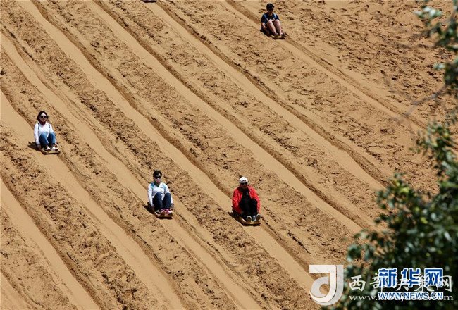 8月22日,游客在中衛(wèi)市沙坡頭旅游景區(qū)體驗滑沙。沙坡頭旅游景區(qū)因地制宜發(fā)展沙漠旅游,旺季日接待游客量達(dá)兩萬人次。新華社記者伍婧丹攝