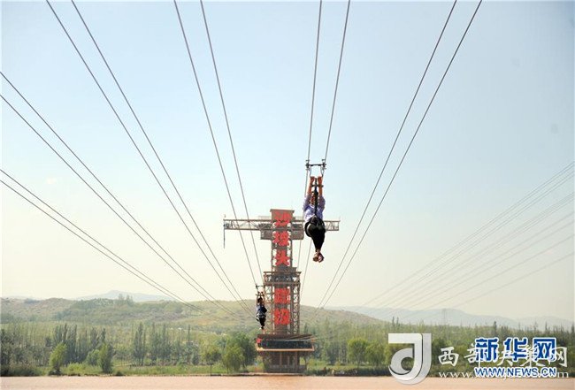 8月22日,游客在中衛(wèi)市沙坡頭旅游景區(qū)體驗溜索。沙坡頭旅游景區(qū)因地制宜發(fā)展沙漠旅游,旺季日接待游客量達(dá)兩萬人次。新華社記者任鵬飛攝