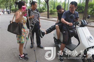 昨日,新生江楠拄拐行走太久手部酸痛,坐上老師的車。