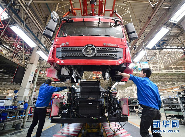 工人在陜重汽汽車總裝配廠車間內(nèi)操作駕駛室吊具,將駕駛室與底盤進行連接(3月15日攝)。新華社記者 邵瑞 攝