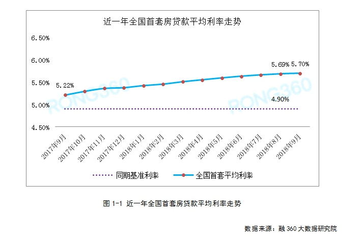 融360監(jiān)測數(shù)據(jù)顯示,2018年9月全國首套房貸款平均利率為5.70%,環(huán)比小幅上升0.18%,同比去年9月5.22%的利率上升9.20%。