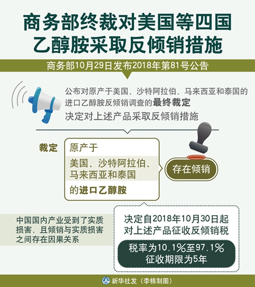 圖表:商務(wù)部終裁對美國等四國乙醇胺采取反傾銷措施 新華社發(fā) 李棟 制圖