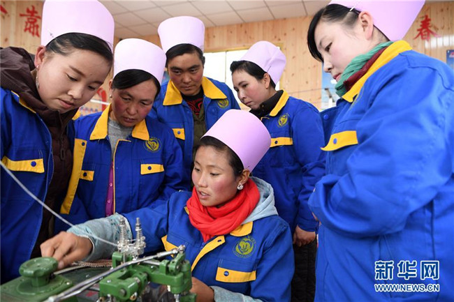 11月6日,在東鄉(xiāng)族自治縣大樹鄉(xiāng)“扶貧車間”,留守婦女向熟練工(中)學(xué)習(xí)操作技巧。