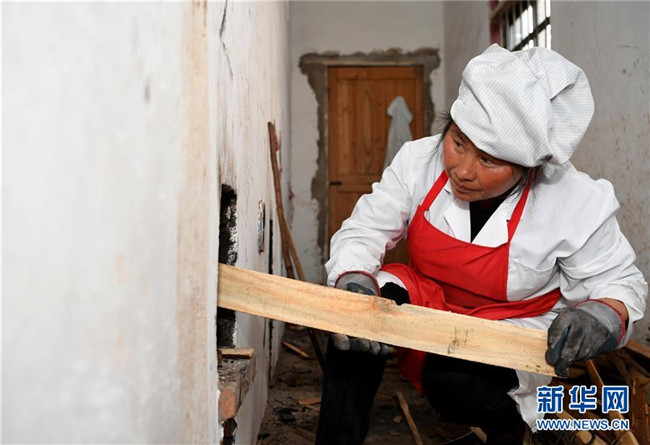 11月22日,姚新花在鍋巴廠(chǎng)里為土灶添柴。 新華社記者 徐亮攝