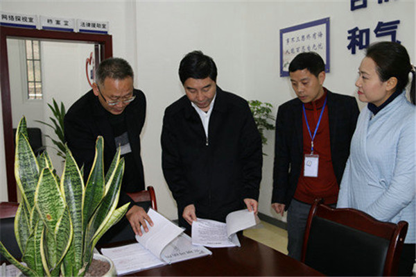 在張壩司法所,劉志誠察看了社區(qū)矯正宣告室、人民調(diào)解室、法律援助工作站,仔細(xì)翻閱相關(guān)資料,關(guān)切詢問工作人員司法所人民調(diào)解、法律援助等業(yè)務(wù)工作情況及對司法行政工作意見建議。走進(jìn)龍馬潭區(qū)誠達(dá)公證處,映入眼簾的標(biāo)識標(biāo)牌讓劉志誠對該處的黨建引領(lǐng)和文化建設(shè)表示滿意,他親切地與公證員交流互動(dòng),了解公證處黨建促發(fā)展、公證參與司法輔助、“最多跑一次”、等工作情況。劉志誠指出,公證服務(wù)是黨委政府為民服務(wù)的形象和代表,要把人民群眾滿不滿意作為檢驗(yàn)公證工作成效的標(biāo)準(zhǔn),全心全意為群眾做好法律服務(wù)。在自貿(mào)區(qū)在建瀘州市公共法律服務(wù)中心,劉志誠指出,公共法律服務(wù)中心是服務(wù)群眾的窗口,在設(shè)計(jì)規(guī)劃中要拓寬思路,整合法律服務(wù)功能,從便民利民出發(fā),從群眾的需要做起,將公共法律服務(wù)中心建成群眾滿意、企業(yè)滿意、黨委政府滿意的標(biāo)準(zhǔn)化服務(wù)平臺。