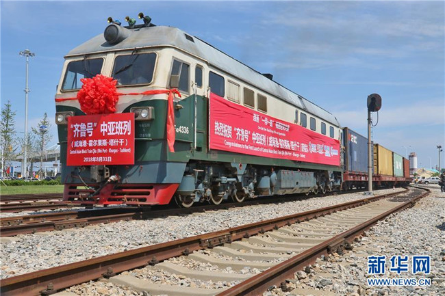 滿載貨物的“齊魯號(hào)”中亞班列從山東威海港出發(fā),駛往烏茲別克斯坦首都塔什干(2018年8月31日攝)。新華社發(fā)(唐克 攝)