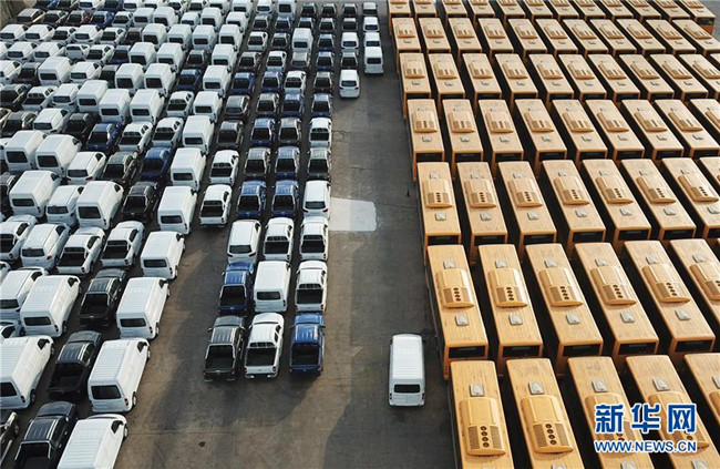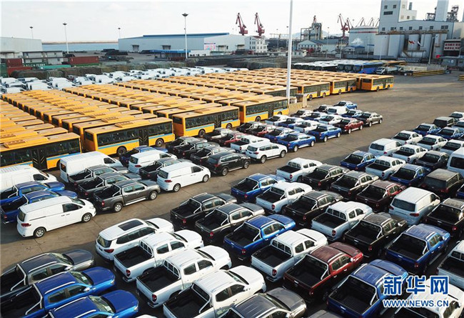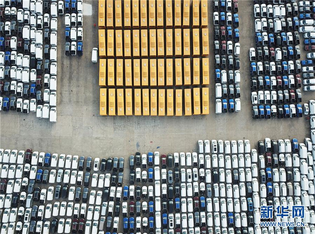 大批國(guó)產(chǎn)車輛在江蘇連云港港口碼頭等待裝船(2018年12月31日無人機(jī)拍攝)。新華社發(fā)(耿玉和 攝)