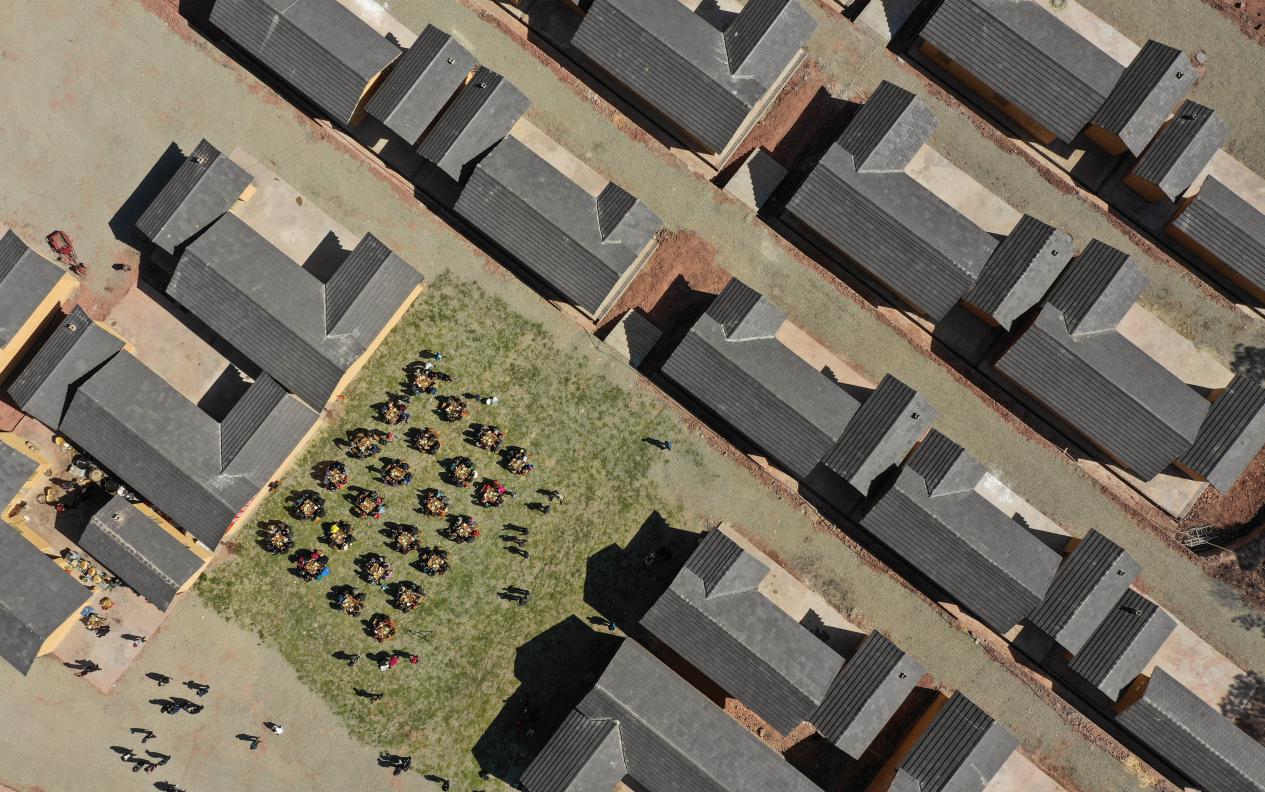 2019年2月11日,在昭覺縣三河村的易地扶貧安置點,彝族群眾圍坐在一起吃起壩壩宴,熱熱鬧鬧地慶祝喬遷之喜。來源:新華網(wǎng)