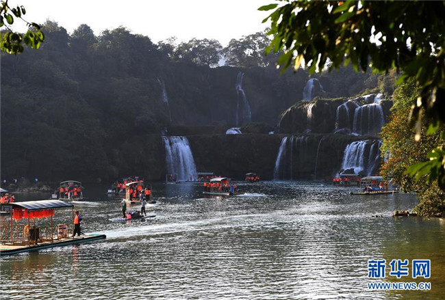 位于中越國際旅游合作區(qū)的大新縣德天瀑布,游客如織(2月8日攝)。新華社記者 周華 攝