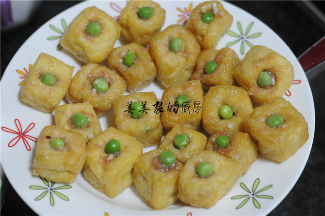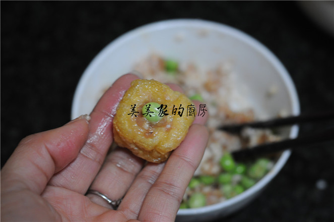 4.油豆腐表面用筷子撮一個(gè)洞,將拌好的餡慢慢塞入油豆腐里,盡量塞滿,在洞口上塞上一顆青豆裝飾。