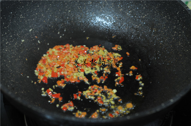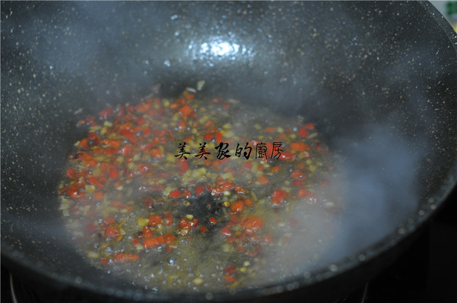 7.油鍋燒熱,將姜蒜末倒入鍋中,炒出香味后加入剁辣椒,撒入鹽,翻拌均勻。