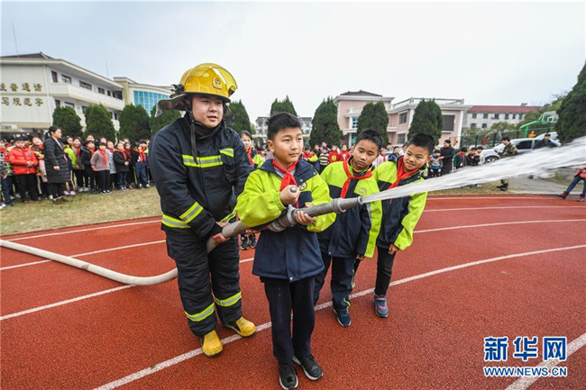 3月6日,東林鎮(zhèn)消防應(yīng)急救援隊的隊員帶領(lǐng)小學(xué)生們體驗水槍的使用。當(dāng)日,浙江省湖州市吳興區(qū)東林鎮(zhèn)東林小學(xué)舉行“開學(xué)第一課”消防安全進(jìn)校園活動。東林鎮(zhèn)消防應(yīng)急救援隊的隊員們通過普及消防安全知識、應(yīng)急逃生知識等內(nèi)容,讓學(xué)生們了解日常消防安全常識,增強消防安全意識。新華社記者 徐昱 攝