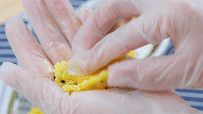 *餅的大小要根據(jù)紅薯?xiàng)l的長度來,保證能把紅薯?xiàng)l完全包裹住就行嘍。