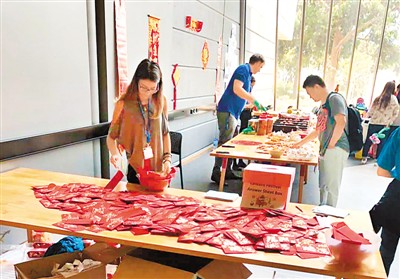 春節(jié)那天,學(xué)校為中國留學(xué)生安排了新春活動,準(zhǔn)備了很多裝有金幣巧克力的紅包,派送的小餅干里還夾著新年祝福;不經(jīng)意間,我驚喜地發(fā)現(xiàn),墻面上還藏了許多謎語。對于過年還要上課的我們來說,這已是最大的“年味”了。