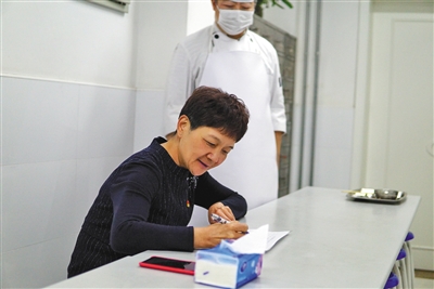 安樂(lè)幼兒園園長(zhǎng)張萍試吃幼兒午餐并進(jìn)行記錄評(píng)價(jià)。新京報(bào)記者 馮琪 攝