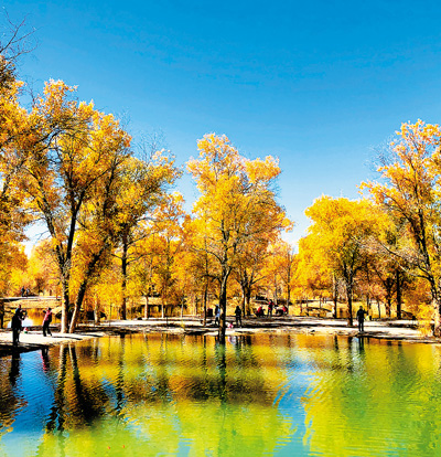 甘肅金塔胡楊林是三北防護林體系的一部分。圖為2018年10月9日,游人在金塔森林公園觀賞胡楊林美景。王 春攝(人民視覺)