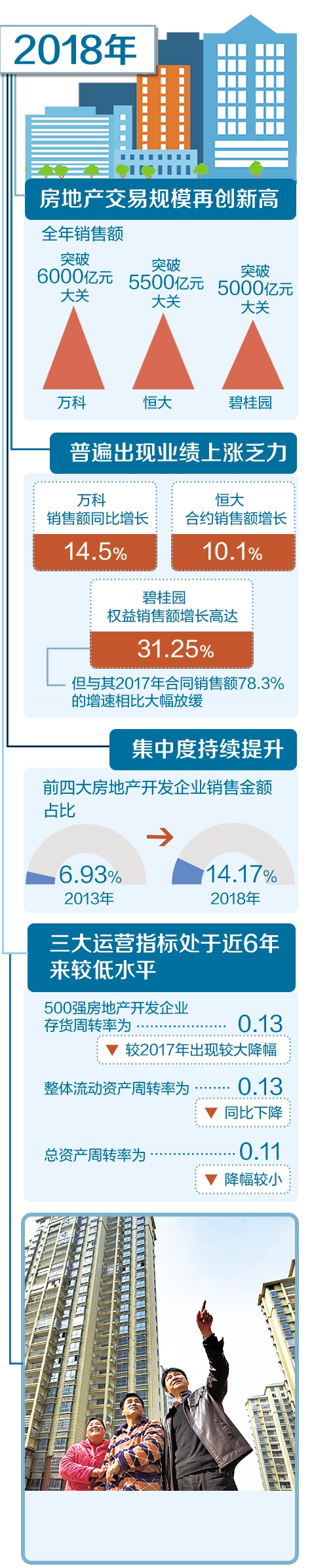 “活下去”。龍頭房企萬科在去年作出了房地產(chǎn)行業(yè)轉(zhuǎn)折已經(jīng)到來的判斷。雖然萬科發(fā)出的聲音略顯夸張,但隨著我國房地產(chǎn)調(diào)控長效機(jī)制不斷完善,房地產(chǎn)行業(yè)的“黃金時(shí)代”正在漸行漸遠(yuǎn)。近日密集發(fā)布的上市房企年報(bào)顯示,多數(shù)房企在營收、利潤方面業(yè)績理想,但銷售額增幅在逐步告別高增長,進(jìn)入中速增長。在行業(yè)集中度不斷提高、行業(yè)增速放緩的情況下,聚焦主業(yè)、精細(xì)化運(yùn)營、提升品質(zhì)、多元化布局成為各大房企角力的關(guān)鍵詞。