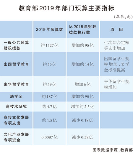 關于資金來源,教育部2019年部門預算顯示,2019年一般公共預算財政撥款約為1527億元,比上年執(zhí)行數增加約95億元。其主要原因為生均綜合定額、出國留學經費以及學生資助工作專項等支出增加。