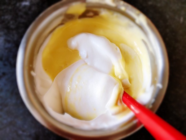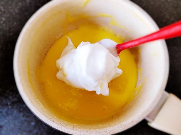 7.少許蛋白霜加入蛋黃糊中。