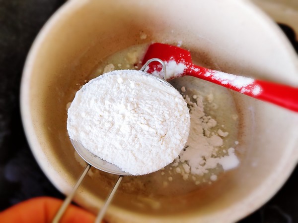 3.糖融化后立即關(guān)火,把低筋粉篩進(jìn)去。