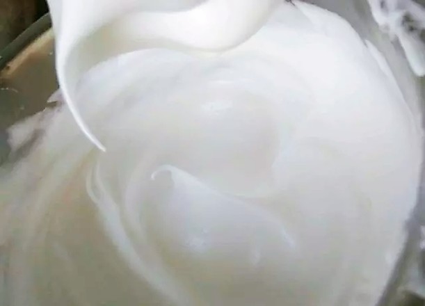 6.蛋清中滴入檸檬汁,分三次加入細(xì)砂糖,打發(fā)到小彎鉤狀態(tài)。