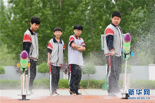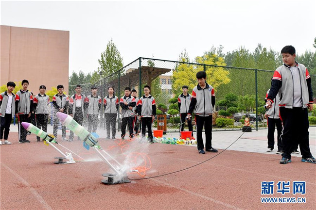 4月24日,河北省廊坊市第十三中學學生在發(fā)射水火箭。當日是中國航天日,河北省廊坊市第十三中學舉辦航天主題活動,通過讓學生了解水火箭發(fā)射原理,體驗水火箭發(fā)射過程,激發(fā)學生科學探索精神。 新華社記者 王曉 攝