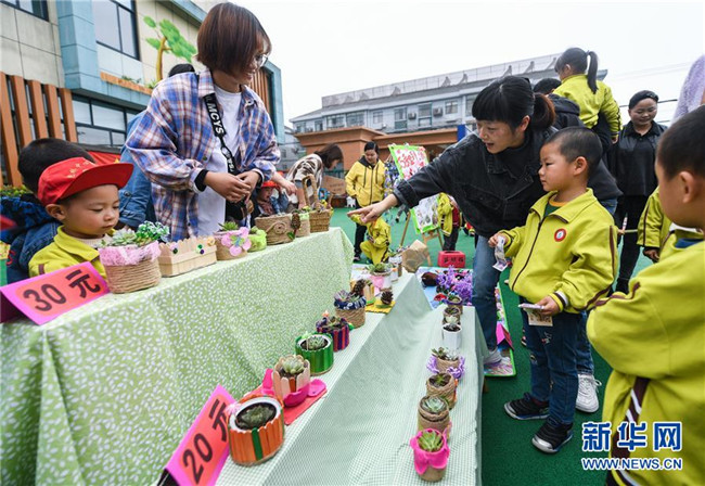 4月28日,家長帶著孩子們在挑選用廢舊罐子等作花盆的小盆栽。 新華社記者 徐昱 攝